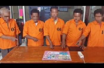 TAPUNG – jurnalpolisi.id Unit Reskrim Polsek Tapung tangkap 5 orang pelaku judi jenis song, disebuah warung di Dusun II Kota Batak Desa Pantai Cermin Kecamatan Tapung, pada Jumat siang (05/11/2021). Para pelaku judi yang diamankan Aparat Kepolisian ini adalah JP (46), JS (61), JW (35), JU (53) dan JM (40), mereka semua beralamat di Desa Pantai Cermin Kecamatan Tapung. Bersama pelaku turut diamankan barang bukti 108 lembar kartu remi dan uang tunai sebesar Rp 459 ribu yang digunakan sebagai taruhannya. Pengungkapan kasus ini berawal pada Jumat (05/11/2021) sekira pukul 14.00 wib, saat itu Panit Reskrim Polsek Tapung IPTU Lambok Hendriko SH mendapat informasi dari masyarakat, tentang adanya sekelompok orang tengah bermain judi jenis song, disebuah warung di Dusun II Kota Batak Desa Pantai Cermin Kecamatan Tapung. Menindaklanjuti informasi tersebut, Kapolsek Tapung Kompol Sumarno perintahkan anggota Unit Reskrim Polsek Tapung mendatangi lokasi untuk melakukan penyelidikan. Setiba dilokasi Tim menemukan 5 orang pria sedang bermain judi menggunakan kartu remi dan uang taruhan, petugas langsung mengamankan ke-5 pelaku beserta barang bukti dan membawanya ke Polsek Tapung untuk menjalani pemeriksaan lebih lanjut. Kapolsek Tapung Kompol Sumarno saat dikonfirmasi membenarkan penangkapan 5 orang pelaku judi tersebut, disampaikan bahwa para pelaku kini telah diamankan di Polsek Tapung untuk menjalani proses hukum lebih lanjut, jelasnya. (Anto D)