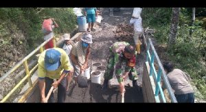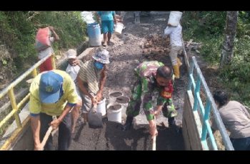 Kebumen – jurnalpolisi.id KODIM 0709/KEBUMEN, Perbaiki sarana infrastrukur yang ada di wilayahnya, Babinsa Koramil 03/Sempor Sertu Tony Ismoyo bersama warga masyarakat binaannya melaksanakan kerja bakti pengecoran jalan desa di Dukuh Karangjoho Desa Sempor Kecamatan Sempor Kab. Kebumen, Kamis (23/12/2021). Kerja bakti pengecoran jalan tersebut di lakukan untuk mempercepat penyelesaiannya, tujuannya meningkatkan kenyamanan warga dalam menggunakan akses jalan yang telah di perkeras, mengingat kondisi jalan sebelumnya hanya berupa tanah dan licin mengingat sekarang musim penghujan tiba. “Berkat kerja sama dan banyaknya warga masyarakat yang hadir dalam kerja bakti ini, pengecoran jalan jadi lebih ringan dan dapat segera di selesaikan dan jalan ini sangat bermanfaat bagi masyarakat, selain sebagai penghubung ke rumah-rumah warga, juga sangat membantu masyarakat dalam mengangkut hasil kebun mereka,” ungkap Babinsa. Suwaji selaku Kadus III Desa Sempor sangat mengapresiasi dan mengucapkan terimakasih kepada Babinsa yang selama ini telah berperan aktif dalam berbagai kegiatan di kampung, “keberadaan Babinsa di kampung kami sangat berdampak positif, terutama seperti kegiatan kerja bakti yang sedang kita laksanakan ini, kehadirannya memberikan motifasi dan semangat kepada masyarakat untuk ikut bekerja sama membangun kampung kita,” tandasnya. ( Pewarta : Arif JPN )