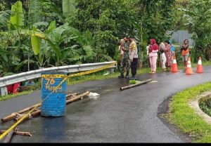 Purbalingga – jurnalpolisi.id Jalan Desa Wirasaba, Kecamatan Bukateja ambles akibat talud ambrol tergerus air luapan Sungai Serayu. Karena membahayakan, untuk mencegah jalan dilewati kendaraan polisi dari Polsek Bukateja memasang tanda peringatan di lokasi tersebut, Kamis (23/12/2021) pagi. Dari pantauan jalan ambles memiliki panjang kurang lebih 12 meter. Dengan kedalaman sekitar tujuh meter. Jalan tersebut merupakan penghubung dua dusun di Desa Wirasaba. Kapolsek Bukateja Iptu Wartono mengatakan peristiwa jalan ambles terjadi pada Rabu (22/12/2021) malam sekira jam 23.30 WIB. Penyebabnya akibat hujan deras yang menyebabkan Sungai Serayu meluap. Sehingga talud jalan tergerus air dan ambles karena posisi jalan dekat dengan sungai. “Tidak ada korban jiwa akibat kejadian tersebut namun kendaraan tidak bisa dilalui dan berpotensi menimbulkan bahaya bagi pengendara,” jelasnya. Kapolsek menjelaskan untuk mencegah warga nekat melintas, di lokasi tersebut dipasang tanda peringatan. Selain memasang traffic cone dipasang juga garis polisi. Harapannya warga tidak melintas di jalur tersebut sampai ada perbaikan. “Kami pasang Traffic Cone dan garis polisi di lokasi jalan ambles. Masyarakat bisa menggunakan jalan alternatif yang bisa digunakan untuk menghubungkan dua dusun tersebut,” katanya. Kapolsek menambahkan pihaknya sudah berkoordinasi dengan pemerintahan desa dan kecamatan. Selain itu meneruskan informasi kepada dinas terkait agar bisa segera dilakukan perbaikan. (Sambudi JPN)