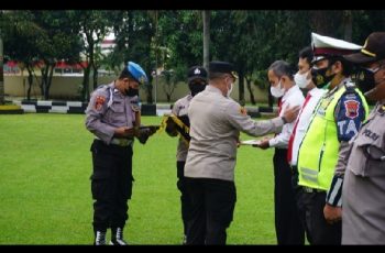 Banyumas – jurnalpolisi.id Senin (6/12), Kapolresta Banyumas Kombes Pol M. Firman L. Hakim, S.H, S.I.K., M.Si., memimpin apel pagi di halaman Mapolresta Banyumas. Apel pagi ini diikuti oleh Wakapolresta Banyumas AKBP Kristanto Yoga Darmawan, S I.K., M.Si., PJU, perwakilan Bahbinkamtibmas Polsek Jajaran, personel Polresta Banyumas serta PNS. Kapolresta Banyumas dalam kesempatan tersebut juga memberikan reward (penghargaan) kepada para personel yang berprestasi diantaranya juara 1 beregu lomba menembak dalam rangka HUT Korps Brimob ke 75 tahun 2021 dan pelaksanaan vaksinasi mobile. “Saya minta tidak cukup hanya sampai disini. Silahkan rekan rekan berprestasi, berprestasi yang baik. Masih ada kegiatan lain yang dapat kita lakukan dengan memberikan pelayanan kepada masyarakat yang dapat menjadikan prestasi kita semua. Kita tunjukan kepada masyarakat bahwa kita ini memberikan pelayanan terbaik kepada masyarakat”, tutur Kapolresta Banyumas dalam arahannya kepada peserta apel. ( Arif JPN )
