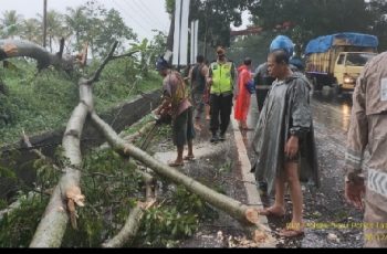 Tasikmalaya – jurnalpolisi.id Hujan lebat disertai angin kencang telah mengakibatkan pohon tumbang di Jalan Raya Ciawi – Malangbong tepatnya kampung Sawah garing Desa Sukamantri Kecamatan Ciawi Kabupaten Tasikmalaya, Selasa (28/12/2021). Bencana alam angin kencang yang menerjang Wilayah Ciawi dan menumbangkan pohon ke jalan raya, akibatnya arus lalu lintas tersendat. Kapolsek Ciawi Polres Tasikmalaya Kota Kompol Setiyana, SH., M.Si. menjelaskan bahwa di Wilayahnya telah terjadi 2 kali bencana yang sama. “Hujan lebat dan angin kencang telah menumbangkan pohon besar ke jalan raya, sehingga arus lalu lintas tadi sempat tersendat sekitar 15 menit,” ungkapnya. “Saya kerahkan TNI-Polri yang ada di Pospam Sukamantri untuk evakuasi dibantu masyarakat setempat,” ujarnya. “Alhamdulilah sekarang arus lalu lintas Ciawi – Malangbong telah normal kembali,” jelasnya. Kapolsek juga menambahkan bahwa di tempat yang sama sudah 2 kali terjadi pohon tumbang. “Kemarin juga terjadi hal yang sama, karena hujan dan angin kencang serta pangkal pohonnya sudah lapuk, sehingga rawan tumbang,” tambahnya. “Dihimbau kepada masyarakat agar selalu berhati-hati dengan cuaca ekstrim saat ini, jangan memaksa berkendara apabila hujan lebat dan angin kencang,” ucapnya. (A.Manulang)