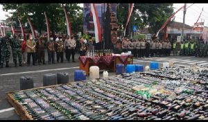 Purbalingga – jurnalpolisi.id Polres Purbalingga melaksanakan pemusnahan barang bukti miras dan narkoba. Kegiatan diselenggarakan di jalan lingkar Alun-alun Purbalingga, usai apel gelar pasukan Operasi Lilin Candi 2021, Kamis (23/12/2021). Kapolres Purbalingga AKBP Era Johny Kurniawan mengatakan hari ini dilakukan pemusnahan barang bukti miras, petasan dan narkoba. Barang bukti ini merupakan hasil kegiatan rutin yang ditingkatkan menjelang Natal dan tahun baru. “Barang bukti ini merupakan hasil pelaksanaan kegiatan rutin yang ditingkatkan oleh kepolisian untuk menjamin keamanan kegiatan Natal dan tahun baru di wilayah Kabupaten Purbalingga,” jelasnya. Disampaikan bahwa total ada 4664 botol miras barang bukti yang dimusnahkan pada hari ini. Termasuk ratusan liter miras jenis Ciu dan Tuak. Selain itu, turut dimusnahakan 750 butir petasan dan narkoba berbagai jenis. Pemusnahan barang bukti miras, petasan dan narkoba didahului dengan penandatanganan berita acara pemusnahan. Kemudian ribuan botol miras digilas menggunakan kendaraan berat. Sedangkan barang bukti petasan dan narkoba dimusnahkan sesuai prosedur pemusnahan. Kegiatan pemusnahan barang bukti miras, petasan dan narkoba dihadiri oleh Bupati Purbalingga Dyah Hayuning Pratiwi dan Forkopimda. Hadir juga Ketua MUI Purbalingga beserta perwakilan tokoh agama dan tokoh masyarakat. (Arif JPN)