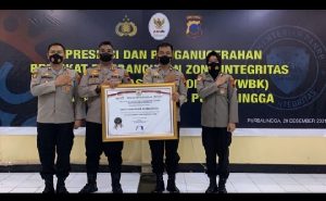 Purbalingga – jurnalpolisi.id Polres Purbalingga berhasil meraih predikat Wilayah Bebas dari Korupsi (WBK) yang diberikan oleh Kementerian Pendayagunaan Aparatur Negara dan Reformasi Birokasi (Kemenpan RB). Pemberian penghargaan dilaksanakan secara virtual melalui zoom meeting di Aula Loka Anindhita Mapolres Purbalingga, Senin (20/12/2021). Kapolres Purbalingga AKBP Era Johny Kurniawan mengatakan hari ini Polres Purbalingga menjadi salah satu penerima penghargaan Wilayah Bebas dari Korupsi. Secara pribadi saya merasa bangga atas kinerja dari rekan-rekan sekalian, karena tidak mudah untuk mendapatkan penghargaan ini. Disampaikan bahwa Polres Purbalingga telah berkomitmen mencanangkan zona integritas melalui enam area perubahan sejak tahun 2018 yang lalu. Setelah melalui berbagai tahap penilaian, pada akhirnya tahun ini bisa mendapatkan predikat WBK. “Setelah dua tahun perjuangan rekan-rekan sekalian Polres Purbalingga akhirnya mendapatkan predikat WBK,” kata kapolres. Kapolres menjelaskan bahwa predikat WBK ini merupakan awal langkah Polres Purbalingga untuk lebih maju. Karena ada satu target lagi yang harus dicapai yaitu predikat WBBM (Wilayah Birokrasi Bersih dan Melayani). “Semoga ini menjadi semangat bagi seluruh personel Polres Purbalingga untuk selalu maju dan meningkatkan pelayanan kepada masyarakat,” ucap kapolres. Kapolres menambahkan dalam memberikan pelayanan kepada masyarakat sejumlah inovasi pelayanan telah dilakukan Polres Purbalingga. Inovasi pelayanan diantaranya Suket Cakep Braling, Randumas Braling, Ideps, SIM Delivery dan Wayang Lalu Lintas. “Kami terus berupaya meningkatkan pelayanan kepada masyarakat. Program boleh bagus tetapi tidak akan baik kalau tidak dilanjutkan pelaksanaannya,” ucapnya. ( Arif JPN)