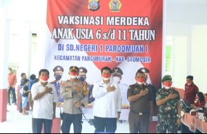 Samosir – jurnalpolisi.id Bertempat di Halaman SD Negeri 1 Pardomuan 1 Kecamatan Pangururan, Bupati Samosir Vandiko T. Gultom bersama Unsur Forkopimda mengikuti acara Launching Vaksinasi Merdeka Anak Usia 6 s.d 11 Tahun yang dilaksanakan serentak diseluruh Indonesia secara virtual, Rabu (5/1/2022). Acara Launching Vaksinasi Merdeka di buka oleh Kapolri Drs. Listyo Sigit Prabowo, Msi, Menko Koordinator PMK Prof. Dr. Muhajir Effendi Map, Wamenkes Dr. Dante Saksono Harbuwono, SpPD-KEMD, Phd. Pada kesempatan tersebut Kapolri menegaskan bahwa angka-angka yang terpapar covid masih ada, terlebih varian baru Omicron yang sudah menyebar di Indonesia sekitar 254 orang yang mana 239 orang dari perjalanan luar negeri dan 15 orang dari lokal Indonesia. Vaksinasi anak usia 6 s.d 11 Tahun sudah dilaksanakan pada tanggal 14 desember oleh Bapak Presiden, vaksinasi ini merupakan lanjutan agar semua anak di Indonesia mendapatkan vaksinasi demi kesehatan dan imun tubuh yang baik, mengingat anak sekolah sudah tertinggal pelajaran sekitar 15%. “Ini merupakan tugas kita bersama untuk percepatan pelaksanaan vaksinasi agar penyebaran covid-19 dan varian baru Omicron dapat teratasi” tegas Kapolri. Setelah Launching kegiatan Vaksinasi Merdeka, Bupati Samosir bersama Unsur Forkopimda meninjau pelaksanaan vaksinasi dan memberikan semangat kepada anak-anak yang akan divaksin dan memberikan semangat dan motivasi kepada petugas vaksinator. Kegiatan ini merupakan program Kepolisian dalan mempercepat target capaian Anak yang di Vaksjn. Kolaborasi antara Pemkab dan Kepolisian akan mempercepat capaian target. Tampak Bupati Samosir Vandiko T Gultom dan Kapolres Samosir Josua Tampubolon menyemangatii anak untuk berani di Vaksin. Kadis Kesehatan Samosir Subarta S menyampaikan sampai hari ini target Vaksin Anak di Samosir per(5/1) mencapai 7% dati jumlah target sekitar 17.000 anak. (D. Uli. N)