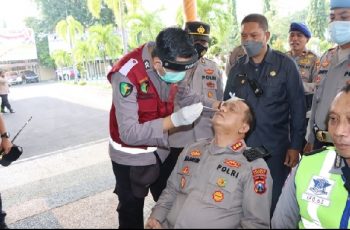 Banyuwangi – jurnalpolisi.id Para personel Polresta Banyuwangi dites swab untuk mendeteksi dan mengantisipasi persebaran Covid-19 varian Omicron di lingkungan kepolisian. Seusai apel pagi pada Senin (31/01/2022) Kapolresta Banyuwangi, para pejabat utama dan seluruh personel Polresta Banyuwangi termasuk PNS Polri menjalani swab tes antigen. Para personel Polresta Banyuwangi menjalani tes swab sebagai upaya antisipasi persebaran Covid-19 varian Omicron. Tes swab dilakukan oleh Tim Sidokkes Polresta Banyuwangi. Kapolresta Banyuwangi, Kombes Pol Nasrun Pasaribu, mengatakan tes swab tersebut dilakukan sebagai upaya deteksi dini untuk mengantisipasi persebaran Covid-19 terutama varian Omicron di lingkup Polresta Banyuwangi serta Polsek jajaran. “Tes swab ini dilakukan sebagai langkah deteksi dini antisipasi. Pada pagi tadi ada sebanyak 127 personel yang menjalani tes swab, tidak ada yang positif. Ke depan personel Polsek jajaran juga akan dilakukan swab tes secara bergiliran untuk memastikan kondisi kesehatan anggota,” ungkap Kapolresta Banyuwangi. Menurut Kombes Pol Nasrun, jika ada personel Polresta Banyuwangi yang didapati positif Covid-19 seusai dites swab antisipasi omicron, personel tersebut akan langsung ditangani. Kesehatan yang bersangkutan akan terus dipantau. Jika ada gejala ringan, yang bersangkutan bisa menjalani isolasi. “Tapi jika ditemukan comorvid, penanganan akan dilakukan dengan mengarahkan yang bersangkutan ke rumah sakit atau tempat isolasi terpusat,” tegas Kapolresta. Di sisi lain Kapolresta Banyuwangi mengimbau seluruh personel Polresta Banyuwangi dan masyarakat di kota Banyuwangi untuk tetap waspada namun tidak panik dalam menghadapi varian Omicron. Kombes Pol Nasrun menekankan, pencegahan Covid-19 dapat dilakukan dengan tetap menerapkan protokol kesehatan (Prokes). Menurutnya sejauh ini Prokes masih menjadi kunci yang cukup efektif dalam menghindari penularan Covid-19 termasuk varian Omicron. “Swab tes antigen ini merupakan salah satu upaya pencegahan Omicron di lingkungan anggota Polri adalah dengan pemberian vaksin booster kepada seluruh anggota Polresta Banyuwangi. Hasil swab tes hari ini dinyatakan negative semua,” papar Kapolresta Banyuwangi. Kapolresta Banyuwangi juga menghimbau kepada seluruh personil Polri khususnya Polres Banyuwangi serta masyarakat Kabupaten Banyuwangi untuk tidak lengah mewaspadai masuknya varian Omicron dengan patuhi protokol kesehatan dan menjaga kesehatan dengan selalu melaksanakan olahraga secara rutin. “Anggota dalam bekerja di tengah masyarakat harus dalam kondisi sehat. Sebelum masyarakat sehat, anggota yang bertugas harus sehat terlebih dulu,” tutup Kapolresta Banyuwangi. (Humas Polresta Banyuwangi)