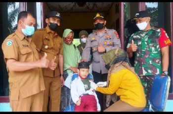Setiba di lokasi vaksin, Kapolsek Serbajadi Iptu Hendra Sukmana, S.H. bersama unsur Muspika Kecamatan Peunaron menyapa langsung dan memberikan semangat kepada murid-murid SD Alue Kijing yang menjadi peserta vaksin.