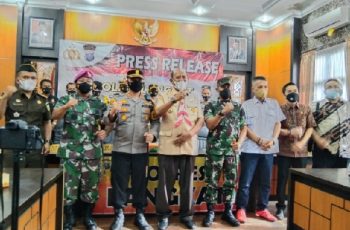 Langkat – Jurnal polisi.id Polres Langkat menggelar press release akhir tahun 2021, bertempat di Aula Wirasatya Mapolres Langkat, Kamis (30/12/2021). Pres release dipimpin Kapolres Langkat AKBP Danu Pamungkas Totok. Hadir mendampingi Bupati Langkat Terbit Rencana PA melalui Wakil Bupati Langkat H. Syah Afandin. Wabup Langkat dikesempatan itu menyampaikan pertanggal 28 Desember 2021, capaian vaksinasi dosis I (satu) di Langkat adalah 73,24 persen. Sedangkan kumulatif vaksinasi Dosis I dan II sebanyak 844.602 dosis. Wabup juga menyampaikan penurunan kasus COVID-19 di akhir 2021, terjadi mulai Agustus sampai Desember 2021 sebanyak 100 persen.”Penurunan terjadi pasca puncak penyebaran COVID-19,” sebutnya. Penurunan, kata Wabup, sebab pemerintah berperan dalam menekan penyebaran COVID-19 dengan strategi levelisasi pandemik. Selain pembatasan kegiatan masyarakat, vaksinasi yang massif yang digelar di seluruh jajaran Polres Langkat dan pihak terkait juga berdampak pada rendahnya transmisi COVID-19. Untuk zonasi penyebaran COVID-19 di Langkat, total terkonfirmasi 2.056 jiwa, konfirmasi sembuh 2.204 jiwa dan konfirmasi meninggal 302 jiwa. Saat ini juga terus dilakukan optimalisasi penanggulangan COVID-19 dengan pemberlakukan pembatasan kegiatan masyarakat (PPKM). Berupa 3T (Testing, Tracing & Treatment). Percepatan vaksinasi Presisi Polda Sumut, vaksinasi serentak dan bantuan sosial. Serta dilakukan 4 (empat) bidang commander wish Kapolda Sumut. Yaitu penanggulangan COVID-19. Dukungan pada program prioritas nasional. Penanganan gangguan Kamtibmas. Serta transpormasi menuju kultur yang melayani. Diketahui, sebut Wabup, melalui program 1 Polisi 1 Keluarga yang dilaksanakan setiap bulannya. Saat ini Polres Langkat telah memberikan paket sembako kepada warga yang terdampak COVID-19 sebanyak 17.680 paket. Selanjutnya, Wabup juga menyampaikan jumlah tindak pidana pada 2021 yang ditangani Polres Langkat sebanyak 1.610 kasus.”Ini terendah dalam 3 (tiga) tahun terakhir,” sebutnya. Polres Langkat berhasil menyelesaikan kasus tindak pidana sebesar 73,42 persen yang ditangani pada 2021. Untuk kasus narkotika jumlah tindak pidana 268 kasus. Putusan tindak pidana 224 kasus. Sedangkan tersangkanya sebanyak 325 orang.”Barang bukti berhasil disita adalah daun ganja 144,944,42 gram, sabu 3.643,75 gram dan extacy 15,36 gram,” paparnya. Menambahkan Kapolres Langkat, bahwa vaksin ke dua mulai dilaksanakan pada Januari 2022.Ia juga menghimbau anak usia 6 sampai 12 tahun sudah bisa di vaksin pada Januari 2022. Kapolres juga menyampaikan pada malam akhir tahun pihaknya akan melakukan rekayasa lalulintas, agar tidak mengundang keramaian.Pihaknya juga melarang bermain petasan dan menimbulkan kerumunankerumunan. “Di lapangan alun-alun, tidak ada yang boleh bermain petasan dan menimbulkan kerumunan,” tegasnya. Turut hadir Dandim 0203 Langkat Letkol Inf. Wisnu Joko Saputro, Danyonif 8 Marinir Tangkahan Lagan Letkol Mar. Farickh, Sai Sintong mewakili Kajari Langkat, Diki Irvandi mewakili Ketua PN Langkat, Ketua PWI Langkat Darwis Sinulingga serta sejumlah jajaran Pemkab dan Polres Langkat.(Sahrul)