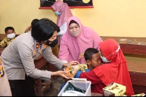 Lamtim, jurnalpolisi.id Waka Polres Lampung Timur Kompol Heti Patmawati, S.H., S.I.K., M.H. saat Mendampingi Kapolres Lampung Timur AKBP Zaky Alkazar Nasution, S.H., S.I.K., M.H. meninjau Langsung Kegiatan Vaksinasi Covid-19 untuk anak SD 6-11 Tahun. Heti menyampaikan bahwa Perlu kerja keras bagi vaksinator untuk bisa melakukan vaksin Covid-19 terhadap anak dengan segala cara dilakukan agar anak-anak mau mengikuti vaksinasi tersebut. Giat Vaksinasi Covid 19 di Sekolah Dasar Negeri 2 Sukoe Kecamatan Sekampung , Kabupaten Lampung Timur, Rabu (19/1/2022). Waka Polres Cantik ini sampai turun tangan membujuk anak-anak agar mau mengikuti penyuntikan vaksin. “Sini ibu dampingi sayang, nanti habis di suntik akan dikasih jajanan iya Sayang, dan dilantiknya juga gak sakit cuma kaya di gigit semut,” rayu Polwan Cantik kepada salah seorang anak yang takut divaksin. Kapolres Lampung Timur AKBP Zaky Alkazar Nasution, S.H., S.I.K., M.H. pada Kesempatan tersebut juga menghimbau kepada seluruh instansi terkait untuk membantu Pemerintah Daerah dalam percepatan vaksinasi bagi masyarakat umum maupun anak-anak, dengan adanya kolaborasi yang baik dari seluruh unsur dapat mempercepat terbentuknya herd immunity. “Bantu untuk sosialisasi ke masyarakat maupun para orang tua, kalau vaksin ini aman dan halal, serta dengan dilaksanakan vaksin dapat mengurangi dampak apabila terpapar virus covid-19, sehingga anak-anak kita juga akan aman dan nyaman ketika pelaksanaan Pembelajaran Tatap Muka (PTM) berlangsung,” imbuhnya. (Maedi/AS/Humas Polres Lampung Timur)
