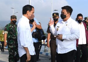 Samosir – Jurnal Polisi id Bupati Samosir Vandiko T Gultom mengahadap Presiden RI Joko Widodo di Hotel Samosir Cottage Kecamatan Simanindo Kabupaten Samosir tempat Presiden menginap. Pertemuan di pagi hari, Kamis (3/2) dilakukan sebelum Presiden meninggalkan Kabupaten Samosir untuk melanjutkan Tugas Negara. Dalam pertemuan tersebut, Bupati Samosir menyampaikan beberapa usulan pembangunan dengan pembiayaan Dana Pusat antara lain;-Pembangunan Rumah adat 5 puak perwujutan samosir titik nol perdapan Batak,-Pembangunan Sarana air bersih,-Pembangunan jalan 45 Desa Wisata,-Peningkatan Daerah Irigasi menjadi Irigasi Nasional dan Pembangunannya,-Pembangunan Water Front City Nainggolan dan Onanrunggu,-Lanjutan pembangunan penataan kampung ulos Hutaraja,-Pembangunan sarana dan prasarana destinasi Desa wisata.-Pembangunan pertanian terpadu. Bupati Samosir mengucapkan terimakasih atas kunjungan kerja Presiden Jokowi di Kabupaten Samosir, Bupati berharap kepada Presiden Jokowi segala usulan yang telah disampaikan dapat segera terealisasi, guna mendukung wisata Samosir sebagai salah satu Kawasan Destinasi Pariwisata Super Prioritas (DPSP) dan meningkatkan kesejahteraan masyarakat Samosir. Rombongan bertolak dari Hotel menuju Pelabuhan Ambarita, nampak terlihat sebelum Pak Presiden memasuki Kapal penyeberangan, Bupati Samosir berbincang serius dengan Pak Joko Widodo untuk meyakinkan usulan-usulan pembangunan di Kabupaten Samosir. ( D. Uli . N )