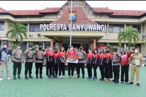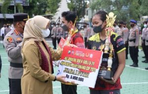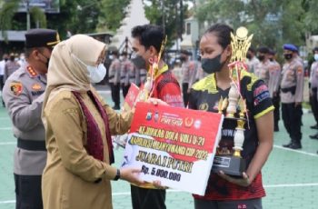 BANYUWANGI – jurnalpolisi.id Upacara penutupan Kejurkab Bola Voli U-21 Kapolresta Banyuwangi Cup 2022 dan penyerahan trophy dilaksanakan pada hari Senin (14/02/2022) bertempat di halaman Mapolresta Banyuwangi. Kegiatan tersebut dihadiri oleh Forkopimda Banyuwangi, para pejabat utama, para Kepala SKPD, Kepala PUDAM dan anggota Polresta Bantuwangi, serta para juara dalam Kejurkab Bola Voli U-21 Kapolresta Banyuwangi Cup 2022 Tim Putra dan Tim Putri beserta para ofiicial. Kepala.Kepolisian Resor Kota (Kapolresta) Banyuwangi Kombes Pol Nasrun Pasaribu selaku inspektur upacara. Komandan upacara Kabag SDM Kompol Idham Kholid. Penyerahan hadiah dilakukan oleh Kapolresta Banyuwangi bersama jajaran Forkopimda secara bergantian kepada para juara. Dari 48 tim.yang bertanding, yang terdiri dari 24 tim putra dan 24 tim putri keluar sebagai Juara Tim Putra berturut-turut adalah Juara satu Polsek Banyuwangi, Juara dua Polsek Srono, Juara Tiga Polsek Wongsorejo, dan Juara Empat Tim Putra Polsek Glagah. Sedangkan Juara Tim Putri diraih oleh Polsek Banyuwangi juara satu, Juara dua Polsek Muncar, Juara Tiga Polsek Cluring, dan Juara empat Polsek Tegaldlimo. Para juara selain menerima trophy juga masing-masing menerima uang pembinaan sebesar lima.juta rupiah untuk juara pertama, empat juta rupiah juara kedua, tiga juta rupiah juara ketiga dan dua juta rupiah untuk juara keempat. “Kita semua patut bersyukur atas kerja keras dan sinergitas Forkopimda dan semua pihak atas suksesnya pelaksanaan Kejurkab ini apalagi Kejurkab ini digelar ditengah kerja keras kita dalam penanganan Covid-19,” ucap Kapolresta Banyuwangi.