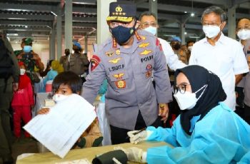 Bekasi – jurnalpolisi.id Kapolri Jenderal Listyo Sigit Prabowo meninjau pelaksanaan vaksinasi massal di 34 Provinsi Indonesia, Kamis (17/2/2022). Adapun target vaksinasi pada hari ini di 5.086 titik yakni 1.100.656 dosis vaksin yang akan disuntikkan. “Secara nasional hari ini kita melaksanakan vaksinasi secara serentak di 34 provinsi ada 5.086 titik dengan target 1.100.656 dosis,” kata Sigit saat meninjau vaksinasi massal di Jababeka Convention Center, Bekasi, Jawa Barat. Sigit merincikan, sebanyak 836.045 vaksin diberikan untuk dosis pertama dan kedua. Kemudian 264.611 vaksin diberikan untuk dosis ketiga. “Tentunya sementara di tempat ini (Jababeka) di laksanakan vaksinasi untuk 10 ribu orang dimana 9 ribu dosis vaksin AstraZeneca dan seribu dosis Sinovac dengan melibatkan 100 vaksinator gabungan TNI-Polri, Dinkes dan relawan,” ujar Sigit. Mantan Kabareskrim Polri ini menyampaikan bahwa Polri dan seluruh jajaran serta yang tergabung dalam Forkopimda akan terus melaksanakan kegiatan akselerasi vaksinasi. Sebab, ia melihat saat ini angka harian Covid-19 varian Omicron sudah melewati puncak angka harian dari varian Delta. “Sehingga mau tak mau kita harus memastikan masyarakat dalam kondisi siap menghadapi. Tentunya dalam kesempatan ini strategi yang dikedepankan adalah bagaimana memastikan agar masyarakat betul-betul sudah vaksin baik dosis pertama dan kedua. Dan bagi yang sudah enam bulan tentu kita harapkan diberikan vaksin booster,” ucap Sigit. Dengan akselerasi vaksinasi, ia berharap imunitas atau kekebalan tubuh masyarakat terbentuk dan siap menghadapi Covid-19 baik varian lama maupun varian Omicron. Walaupun angka positif harian tinggi, Sigit menuturkan angka kematian telihat cukup landai dan ini merupakan kabar baik. Di beberapa wilayah terutama di DKI Jakarta, kata Sigit, diprediksi sudah mencapai puncaknya lantaran angka positif cenderung turun. “Mudah-mudahan ini kita lihat dalam satu minggu ke depan apabila demikian, alhamdulilah satu wilayah sudah melampaui situasi kritis dan kita harapkan di tempat lain juga akan mengalami hal yang sama,” tutur Sigit. Dalam kesempatan ini, Sigit mengajak masyarakat yang belum vaksin agar segera datang ke gerai-gerai vaksin yang sudah disiapkan baik di provinsi, kabupaten, kepolisian, puskesmas dan seluruh tempat yang disiapkan. “Sehingga kita yakin vaksinasi baik dosis pertama, kedua dan ketiga khususnya lansia ini betul-betul bisa terlaksana dengan baik karena memang angka fatalitas atau kematian memang lebih besar berdampak ke lansia atau komorbid angkanya 83 persen,” papar Sigit. Mantan Kapolda Banten ini juga menyampaikan arahan Presiden Joko Widodo (Jokowi) agar masyarakat tetap mematuhi protokol kesehatan meskipun sudah divaksinasi. Penggunaan masker, lanjut Sigit adalah hal yang penting guna melindungi diri sendiri dan orang lain agar tak terpapar Covid-19. “Pemerintah juga sudah mengeluarkan edaran terkait dengan kerumunan dan aktivitas. Tolong diikuti karena ini dalam rangka menjaga keselamatan dan kesehatan masyarakat,” tutup Sigit. (Anto D)