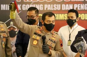 Semarang – jurnalpoisi.id Di tengah kelangkaan minyak goreng di pasaran, dua warga Kudus nekat mencari keuntungan dengan memalsukan minyak goreng dengan dioplos menambah cairan pewarna makanan. Harga jual minyak goreng oplosan itu, dibanderol senilai Rp16.500 per liternya. Hal itu diungkapkan Kapolda Jateng Irjen Pol Ahmad Luthfi saat memimpin konferensi pers di Gedung Ditreskrimum Polda Jateng, Semarang. Selasa, (22/02) Dalam keterangan persnya Kapolda Jateng mengungkapkan dua tersangka yang diamankan aparat Direktorat Reskrimsus Polda Jateng masing-masing berinisial MNK dan AA, dan keduanya melakukan aksi pengoplosan minyak goreng di Desa Cendono Kecamatan Dawe Kudus. Modus yang digunakan adalah mencampur minyak goreng curah, dengan air berisi pewarna makanan berwarna kuning. Sehingga, campuran cairan itu menyerupai minyak goreng pada umumnya. Dalam sekali melakukan pengoplosan minyak goreng dengan air berisi campuran pewarna makanan itu kedua pelaku meraup keuntungan hingga Rp5,6 juta lebih. Sedangkan lokasi pemasaran ada di wilayah Kudus, Pati dan Rembang. Menurut kapolda, aksi pengoplosan minyak goreng sudah dilakukan kedua tersangka sejak tiga bulan. Yang di Kudus pelaku menjual minyak goreng palsu kepada pengusaha home industri kerupuk. “Dia mencari untung dengan cara mencampurkan minyak (goreng) asli dengan (air) zat pewarna. Bahwa pelaku sudah kita endus, dia melarikan diri ke Pacitan dan berhasil kita amankan disana. Kita sudah koordinasi ke polres jajaran untuk melakukan penyelidikan, karena ini sebagai pintu awal dan kita akan kembangkan lebih lanjut,” kata kapolda. Lebih lanjut kapolda menjelaskan, barang bukti yang diamankan dari tangan kedua tersangka adalah satu jeriken berisi 17 liter minyak goreng asli dan 20 jeriken masing-masing berisi air pewarna makanan serta lima jeriken masing-masing berisi 25 liter air biasa. Termasuk uang tunai hasil penjualan sebesar Rp600 ribu, dan satu bendel nota penjualan.