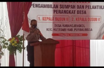 Purbalingga – jurnalpolisi.id Wakapolsek Kutasari Iptu Nyamiran menyampaikan apresiasinya terkait pelaksanaan seleksi Perangkat Desa Karangjengkol yang berlangsung aman hingga pelantikan. Hal tersebut disampaikan Wakapolsek, saat menghadiri pelantikan Perangkat Desa Karangjengkol terpilih di balai desa setempat, Senin (14/2/2022). “Kami sangat bersyukur dan merasa bangga bahwa proses seleksi Perangkat Desa Karangjengkol dari awal bisa berlangsung aman hingga pelantik pada hari ini,” kata Wakapolsek. Menurut Nyamiran, proses dan mekanisme yang baik sesuai ketentuan yang berlaku turut mendukung terciptanya keamanan. Dengan demikian panitia bisa melaksanakan tugas dengan baik dan para peserta juga dapat bersaing secara sehat. “Sinergitas seluruh pihak baik dalam pengamanan dan pemantauan proses seleksi turut juga mendukung kegiatan berjalan lancar. Apresiasi bagi seluruh pihak yang terlibat hingga pelantikan saat ini,” tegasnya. Dalam kesempatan tersebut, Wakapolsek menyampaikan ucapan selamat kepada perangkat desa yang dilantik. Dia berharap setelah menjadi perangkat desa bisa melaksanakan tugas dengan baik dan menjadi tauladan bagi warganya. “Sebagai perangkat desa, harus bisa menjadi contoh bagi warga masyarakat. Semua harus mempunyai prinsip bahwa perangkat desa bertujuan membuat desanya menjadi lebih baik. Karena kemajuan desa menjadi prioritas dan harapan kita semua,” ucapnya. Sementara itu, Kepala Desa Karangjengkol, Sutirah (50) menyampaikan terima kasih kepada seluruh pihak yang telah berkontribusi dalam seleksi perangkat desa di Desa Karangjengkol. Termasuk kepasa jajaran kepolisian, TNI dan Kecamatan yang telah mengamankan jalannya pengadaan perangkat desa hingga proses pelantikan. “Kami mengucapkan terima kasih kepada jajaran TNI, Polri mupun kecamatan yang telah mendukung suksesnya pelaksanaan seleksi perangkat di Desa Karangjengkol dapat berjalan aman dan kondusif,” ucapnya. Dua jabatan perangkat desa yang dilantik adalah Kepala Dusun II dan Kepala Dusun V. Kadus II dijabat oleh Puji Astuti. Sedangkan Kadus V dijabat oleh Rudiono. (Sambudi JPN)