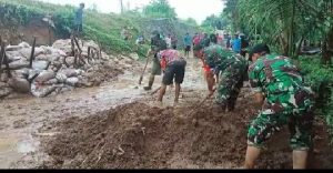 KEBUMEN – jurnalpolisi.id Serda Rudianto Babinsa Koramil 17 Adimulyo kembali melakukan penanganan bencana alam tanah longsor yang terjadi di Jalan penghubung antara desa Sidomukti dengan Desa Arjosari , Kecamatan Adimulyo Kabupaten Kebumen, Kamis (17/03/2022). Guna mempercepat penanganan pasca bencana Hujan semalam dari Pukul 19.00 sampai dinihari , Koramil 17 Adimulyo bersama warga dan aparat terkait melaksanakan kerja bakti membersihkan material longsor yang menutupi ruas jalan penghubung antar desa di Desa Sidomukti RT 07/02 kecamatan Adimulyo. Danramil 17 Adimulyo, Kapten Inf Catur Teguh W menjelaskan, “Cuaca yang kurang bersahabat di musim hujan tahun ini, mengakibatkan adanya tanah longsor di beberapa daerah di wilayah Kecamatan Adimulyo Kab. Kebumen diantaranya Desa Sidomukti ada pun Desa lain ada yg mengalami genanga air meski tidak sampai masuk ke dalam rumah dikarenakan secara geografis kec Adimulyo merupakan daerah Rawan bencal. “Terkait penanganan pasca bencana, saya sudah kerahkan para Babinsa Koramil 17 Adimulyo untuk membantu pemerintah Kecamatan di Desa Sidomukti dalam hal penanganan bencana longsor,“ jelasnya. Kehadiran anggota TNI dilokasi bencana ini adalah sebagai wujud kemanunggalan TNI dengan Rakyat yang siap membantu dan mengatasi kesulitan masyarakat. “Tentu saja dengan kehadiran anggota Koramil 17 Adimulyo Serda Rudianto di lokasi bencana sangat berarti bagi warga yang membuat mereka semakin semangat dalam bekerja bakti. Babinsa bersama ikut serta dalam membantu menangani pembersihan puing-puing sisa longsoran tanah dan sampah-sampah,” pungkas Danramil.( Arif JPN )