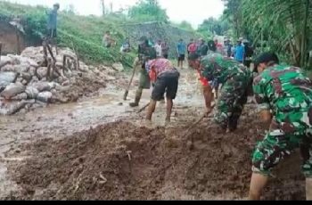 Gerak Cepat Babinsa 17 Adimulyo di Lokasi Tanah Longsor di menutup jalan Desa.