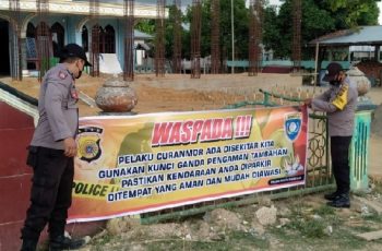 Aceh Timur – jurnalpolisi.id Mengantisipasi pencurian kendaraan bermotor (Curanmor), Polsek Ranto Peureulak terus melakukan imbauan kepada masyarakat, diantaranya dengan memasang spanduk di sejumlah Masjid. Pemasangan spanduk ini diklaim jitu untuk menekan angka aksi kriminalitas. Imbauan itu berisi tulisan yang intinya masyarakat di imbau untuk mewaspadai aksi pencurian kendaraan bermotor. Dalam spanduk tersebut masyarakat juga diminta untuk ikut mencegah tindak pidana curanmor, salah satunya dengan memasang kunci ganda dan memarkirkan kendaraan ditempat yang aman. Kaposlek Ranto Peureulak Iptu Eko Suhendro, S.H. mengungkapkan, pemasangan spanduk himbauan tersebut bertujuan untuk mengingatkan masyarakat agar selalu berhati-hati, waspada dan selalu antisipasi adanya tindak pidana curanmor. “Melalui pesan ini, diharapkan masyarakat menjadi polisi bagi diri sendiri dengan memarkirkan kendaraan, khusunya roda dua dengan kunci tambahan,” sebut Iptu Eko Suhendro, Kamis, (14/04/2022). Menurutnya, pemasangan spanduk pada lokasi yang mudah dibaca oleh warga, diharapkan akan membawa dampak kepada orang tua untuk mencegah anaknya yang belum cukup umur berkendara sendiri. Terang Kapolsek. Tak sampai disitu saja, guna memberi rasa keamanan personel Polsek Ranto Peuerulak melakukan pengamanan dan pengaturan lalu lintas, baik sebelum maupun sesudah pelaksanaan ibadah Shalat Isya dan Tarawih. Kapolsek menyebutkan, pengamanan tersebut akan dilakukan hingga akhir bulan suci Ramadhan mendatang. “Dengan pengamanan ini, para para jamaah akan lebih khusyuk beribadah,” pungkas Kaposlek Ranto Peureulak Iptu Eko Suhendro, S.H. (Tim zbn)