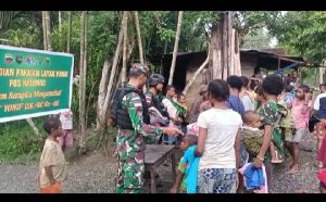 Dalam rangka menyambut HUT Yonif 126/KC ke-60 tahun, Pos Kalimao Satgas Pamtas Yonif 126/KC membagikan pakaian layak pakai kepada warga Kampung Kalimao, Distrik Yaffi, Kabupaten Keerom.