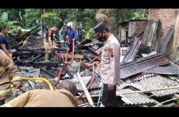 Kebumen – jurnalpolisi.id Diduga korsleting listrik, dua rumah milik warga Desa Pringtutul, Kecamatan Rowokele, Kebumen, ludes terbakar. Berdasarkan informasi yang berhasil dihimpun, rumah milik Surati (62) rusak 100 persen tidak menyisakan apapun, selanjutnya rumah anaknya Sugito (39), ludes pada bagian dapurnya. Dijelaskan Kapolres Kebumen AKBP Piter Yanottama melalui Kasi Humas Polres AKP Tugiman, kebakaran dua rumah terjadi pada hari Kamis (7/4), sekitar pukul 14.45 WIB. Meski tak ada korban jiwa, kebakaran menyisakan duka mendalam bagi para korban. “Awalnya, Ibu Surati mendengar suara ledakan dari dalam rumahnya. Lalu saat korban keluar rumah melihat rumahnya sudah terbakar pada bagian atap,” jelas AKP Tugiman, Jumat (8/4). Melihat kejadian itu, para tetangga membantu korban memadamkan api menggunakan alat seadanya. Namun karena bangunan rumah terbuat dari kayu, api dengan segera merambat ke seluruh bangunan dan membakar seluruh rumah Surati. Dapur rumah Sugito, yang kebetulan berdekatan dengan rumah Ibunya turut menjadi korban kebakaran. Meski tak ada korban jiwa, Surati ditaksir mengalami kerugian 22 juta Rupiah, dan Sugito mengalami kerugian 3,8 juta Rupiah. Kini Surati yang dalam kesehariannya tinggal bersama anaknya di rumah tersebut harus mengungsi di rumah saudaranya. (Arif JPN)