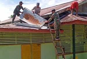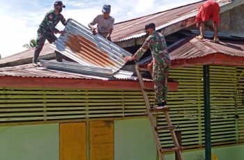 Anggota Satgas Pos Langau 1 bantu warga benahi atap balai desa yang sudah rusak atau bocor, serta kegiatan ini merupakan bentuk kepedulian dan perhatian kepada masyarakat dan pembinaan teritorial.