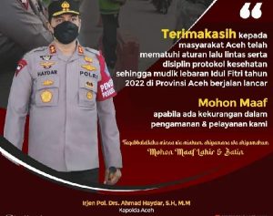 Selaku pimpinan tertinggi di Polda Aceh, Ahmad Haydar mengucapkan terimakasih kepada semua pihak, terutama para pengguna jalan yang sudah mematuhi aturan lalu lintas saat mudik Lebaran.