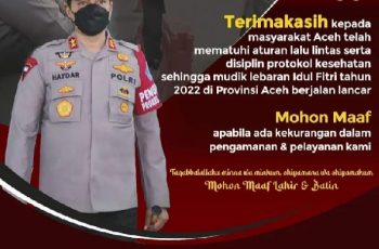 “Terimakasih masyarakat Aceh, terutama para pengguna jalan yang telah mematuhi aturan lalu lintas dan disiplin prokes, sehingga arus mudik Lebaran tahun 2022 berjalan lancar. Mohon maaf juga bila ada kekurangan dalam pengamanan dan pelayanan kami,” kata Ahmad Haydar, Selasa, 10 Mei 2022.