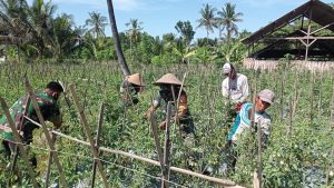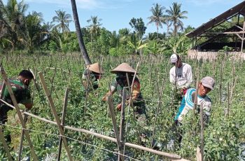 Hari ini, Danramil 1615-11/Aikmel Kapten Inf Anowar bersama Babinsa Kalijaga Timur melakukan pendampingan perawatan tanaman pohon tomat diatas lahan Kelompok tani Sejati milik Faizah di Desa Kalijaga Timur Kecamatan Aikmel Kabupaten Lombok Timur, Selasa (10/5).