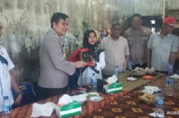 Kapolres Binjai AKBP Ferio Sano Ginting, S.I.K.,M.H memberikan cindera mata kepada ibu Kartika Apulina S.Pd selaku sekdes desa Purwobinangun kecamatan sei bingai kabupaten langkat.(Sahrul)
