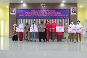 Kapolres juga menyerahkan bantuan pendidikan Kemala dari Ibu Kapolri selaku Ketua Pembina Bhayangkari, juga bantuan pendidikan dari Kapolres untuk anak yatim Polri yang berprestasi.
