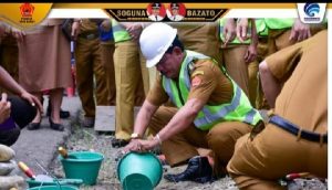 Bupati Nias Barat, Khenoki Waruwu, Letakan batu pertama pembangunan Trotoar, drainase dan lampu jalan di sepanjang ruas jalan Ibu Kota Kabupaten Nias Barat, dimulai di Depan Kantor Bupati Nias Barat, Desa Onolimbu, Lahomi, Senin 9/5)2022.