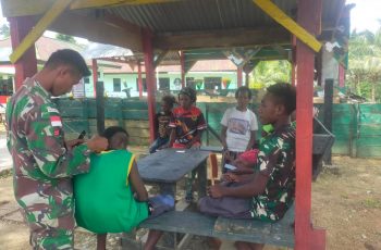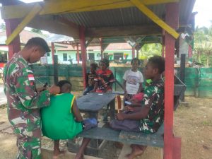 Sebagai bentuk peduli kerapian dan kesehatan terhadap masyarakat Satgas Pamtas Yonif 126/KC Pos KM 140 mencukur rambut para anak-anak Kampung Mongoefi, Distrik Yaffi, Kabupaten Keerom.