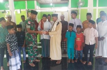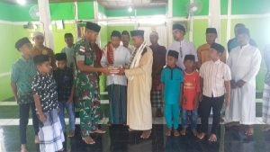 Anggota Satgas Kodim Maluku Batalyon Arhanud 11/WBY Pos Ramil Air Buaya Membagikan Kitab Suci Al-Qur’an kepada pengurus TPQ di Desa Balpetu Kecamatan Kepala Madan Kabupaten Buru Selatan-Maluku, Senin (27/6/2022).