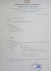 Kemudian kata Muzakkir, menindak lanjuti SK KPU RI itu, Plt Ketua KIP Aceh Timur, Yusri mengundang empat komisioner lainnya pada Senin, 13 Juni 2022 dalam hal undangan rapat pleno tertutup yang akan digelar pada Rabu, 15 Juni 2022 ( Hari ini_Red) tentang penetapan ketua definif KIP Aceh Timur periode 2018- 2023.
