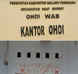 Bukan hanya itu, selembar trimplex yang dipakukan dengan kayu rep tersebut bertuliskan ” Kantor Ohoi Wab ditutup`