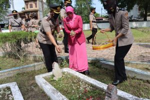 Selanjutnya Kapolresta Deli Serdang didampingi Ketua Bhayangkari Cabang Deli Serdang, dan Pejabat Utama Polresta Deli Serdang, melakukan tabur bunga pada makam pahlawan dan kemudian di tutup dengan mendoakan arwah para pahlawan.