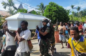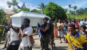Satgas Yonif 126/KC Pos Kalibom terjun langsung untuk membantu dalam prosesi pemakaman warga mulai dari proses ibadah pelepasan jenasah hingga ke tempat penguburan dengan membantu memikul peti jenazah di Kampung Kalibom, Distrik Waris, Kabupaten Keerom.