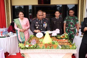 Selanjutnya dilakukan acara tradisi Pemotongan Tumpeng oleh Kapolres Kampar AKBP Rido Purba S.I.K., M.H, didampingi Ketua Bhayangkari Cab. Kampar Ny. Bea Rido, kemudian potongan tumpeng diserahkan kepada dua perwakilan personel yang Tertua Akp Masrial dan Termuda Bripda Aldo Restuah Saragih.