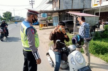 Antisipasi Covid Varian Baru, Satlantas Polres Aceh Timur Bagikan Masker Kepada Pengguna Jalan.