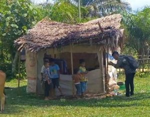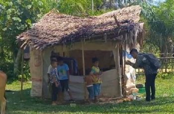 Terlihat rumahnya ditutupi dengan terpal seadanya yang beratapan daun rumbia dengan tujuan agar terhindar dari hujan, panas terik nya matahari dan angin malam.