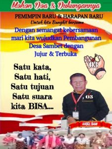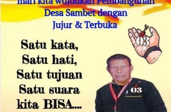 Komitmen calon kades Sambet nomor urut 3 ini digambarkan dalam konsep dan program yang dituangkan di dalam visi dan misi yang siap diaplikasikan atau dijalankannya ketika dirinya terpilih menjadi kepala desa Sambet pada 25 Juli 2022 mendatang.