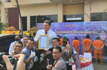Atas Keberhasilan Polresta Tangerang mengungkap sindikat besar pengedar narkoba, Kapolda Banten Irjen Pol Prof. Dr. Rudy Heriyanto memberikan penghargaan atas kinerja Satresnakoba dalam meringkus sindikat besar pengedaran narkoba jenis sabu seberat 43 kg dan 494 butir ekstasi sabu pada Jumat (01/07) pukul 09.00 Wib.