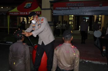 Dalam upacara pembinaan Tradisi pembaretan bagi remaja Polres Teluk bintuni T.A.2022 Kapolres Teluk Bintuni AKBP JUNOV SIREGAR,S.H.,S.I.K. melaksanakan tradisi pembaretan dengan melakukan prosesi siram air kembang kepada perwakilan bintara remaja yang di tunjuk di lanjutan dengan pemasangan atribut (baret) di ikuti oleh para PJU Polres Teluk Bintuni kepad Personel baja yang berjumlah 100 personel.