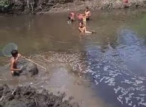 Dari hasil pantauan awak media yang turun kelokasi Sungai Kelundang didampingi rekan lainnya, terlihat warga masyarakat dengan menggunakan peralatan seadanya, mengambil ikan yang mengapung diatas permukaan air sungai.