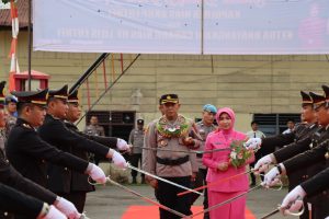 Personil Polres Nias melaksanakan penyambutan Kapolres Nias yang baru AKBP Luthfi, S.I.K. dan Ketua Bhayangkari Cabang Nias Ny. Lilis Luthfi di Mapolres Nias Jalan Bhayangkara No. 01 Kelurahan Ilir Kota Gunungsitoli, Jum’at (15/07/2022) pagi.