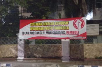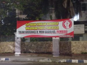 Salah satu sepanduk berbunyi “Ciptakan Sekolah Kondusif, Wujudkan profil Pancasila. Tolak Arogansi H. Moh. Sodik, KS Pembuli,”