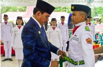 Bupati Nias Barat, Khenoki Waruwu mengukuhkan 34 orang Pasukan Pengibar Bendera Pusaka (Paskibraka) Kabupaten Nias Barat di Aula Soguna Ba Zato Lahomi, Senin (15/08/2022).