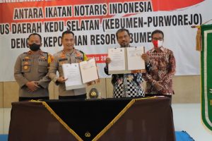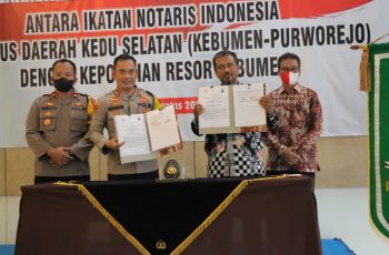 Kerja sama ini ditandai dengan penandatanganan nota kesepahaman antara Polres Kebumen dan notaris di gedung pertemuan Sekar Jagad, Hotel Mexolie Kebumen, Jumat 12 Agustus 2022.