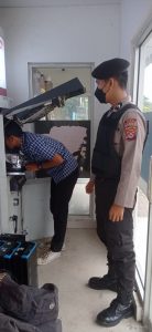 Anggota Sat Samapta Polres Serang Bripda Dwi Fadlur Rohman kawal pengisian mesin Anjungan Tunai Mandiri (ATM). Rabu, (03/08/2022).