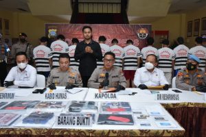 “Hari ini yang digelar adalah hasil ungkap kasus oleh Polda Kepri dan Polres/Ta jajaran, dalam kurun waktu 1 (satu) minggu kami berhasil mengungkap 15 (lima belas) kasus judi yang terdiri dari 8 kasus perjudian konvensional yaitu sie jie 3 kasus (wilayah Polda Kepri sebanyak 2 kasus, Polresta Barelang 1 kasus), gelper 3 kasus (wilayah Polresta Barelang), kartu song 1 kasus (wilayah Polresta Barelang) dan kartu remi 1 kasus (wilayah Polres Bintan) dan 7 kasus perjudian online yang terdiri dari Ditreskrimum Polda Kepri 1 kasus (website), Ditreskrimsus Polda Kepri 1 kasus (website), Polresta Barelang 1 kasus (aplikasi highhs domino), Polresta Tanjungpinang 1 kasus (sie jie online), Polres Karimun 2 kasus (sie jie/togel online) dan Polres Lingga 1 kasus (sie jie/togel online) serta mengamankan 55 (lima puluh lima) orang tersangka.” Ujar Kapolda Kepri Irjen Pol Dr. Aris Budiman, M.Si.