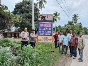 Aksi Tanggap Kapolsek Peureulak Barat, Pasang Spanduk Imbauan Jalan Rusak