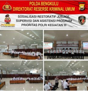 Kegiatan Sosialisasi Restorative Justice oleh tim robinops bareskrim polri tersebut berlangsung di gedung adem polda bengkulu diantaranya Kombes Pol WISNU Caraka ,S.I.K. dan AKBP Ardiyanto Tedjo Baskoro S.H., S.I.K., M.H.